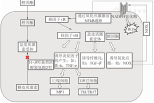 首先,醛固酮(ALD)与MR结合形成复合物,然后,该复合物与ALD诱导或抑制基因的启动子区域内糖皮质激素反应元件结合调节其转录[5]。经典靶细胞中,在ALD存在下,顶端Na+通道以及基底外侧Na+泵和K+通道被上调,致跨上皮钠重吸收持续增加。离子通道重塑是盐皮质激素信号传导的普遍特征。MRA通过离子通道表达或活性调节、限制氧化应激发生、减少炎症反应等减少动脉僵硬、肾小球硬化等发生,从而保护肾功能[5]。ALD和MR激活有害作用的核心机制是氧化应激,ALD/MR复合物上调烟酰胺腺嘌呤二核苷酸磷酸氧化酶亚基表达,从而影响该酶活性。一氧化氮合酶解偶联降低了一氧化氮对血管舒张能力,且增加了过氧化氢的产生及核因子κB(NF-κB)途径活化,致炎症和纤维化。此外,MR激活可使靶细胞中IL-6、TNF-α表达和NF-κB活化,促进巨噬细胞活化为促炎性M1型、促进T淋巴细胞分化为促炎性Th1和Th17亚型,同时,还导致抗炎T调节淋巴细胞数量减少[1](图1)。