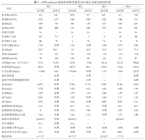 4例Castleman病继发肾损害患者治疗前后实验室检查结果