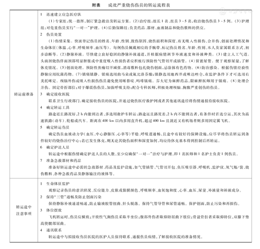 在突发性重大烧伤事件中,严重烧伤伤员转运是救治的重要环节,对预后有重要影响。因此,一旦发生重大烧伤事件,卫生部门应迅速建立烧伤应急医疗队,携带必需的药品、器材前往事故区,把握转运时机,进行转运前的准备及转运途中的治疗,为后续成功救治伤员奠定良好基础。本文是成批严重烧伤伤员的转运方案,单例严重烧伤伤员的转运也可参照执行。此外,为便于携带,笔者将本文进行精简,制作了"成批严重烧伤伤员的转运流程表",详见文后附表。