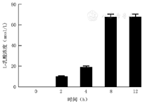 乳酸乳球菌于培养约6 h生长达到平台期。随着培养时间的延长,乳酸乳球菌培养上清液中pH值逐渐降低,于培养8 h下降至最低值,培养8~12 h的pH值保持在4.9左右。见图1。随着培养时间的延长,乳酸乳球菌培养上清液中L-乳酸浓度逐渐升高,于培养8 h达到最高值,约70 mmol/L,见图2。