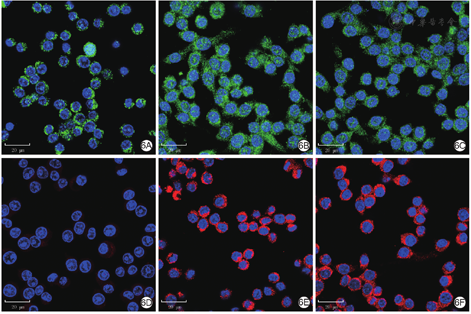 采用免疫荧光法观测。取各组细胞,每组1孔,40 g/L多聚甲醛室温固定10 min,用含体积分数10%山羊血清的PBS封闭1 h。分别加入兔抗小鼠精氨酸酶1多克隆一抗、兔抗小鼠CD206多克隆一抗(稀释比均为1∶1 000),4 ℃下孵育过夜。分别加入Alexa Fluor 488标记的山羊抗兔IgG二抗以及Alexa Fluor 594标记的山羊抗兔IgG二抗(稀释比均为1∶1 000),室温孵育1 h。经DAPI共染后,600倍激光扫描共聚焦显微镜下观察精氨酸酶1和CD206蛋白定位和表达(以荧光强度表示),精氨酸酶1阳性染色为绿色,CD206阳性染色为红色。