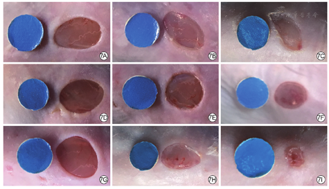 处理3~12 d后,单纯温敏水凝胶组与空白对照组小鼠创面大体情况相似,与该2组比较,乳酸乳球菌温敏水凝胶组小鼠创面愈合速度更快,创面面积明显缩小,创缘组织炎症红肿情况减轻。见图7。