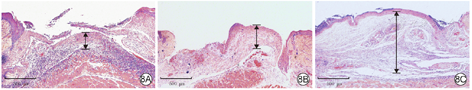 水凝胶处理2组处理12 d后,同1.5.1麻醉小鼠,取适量创面组织经40 g/L多聚甲醛固定,石蜡包埋,以5 μm厚度切片,行HE染色,40倍光学显微镜下观察肉芽组织厚度。空白对照组小鼠于相同时间点进行相应观察。