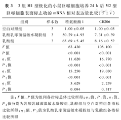 培养24 h,与空白对照组比较,乳酸组巨噬细胞中精氨酸酶1 mRNA表达量上调约65倍、CD206 mRNA表达量上调约8倍(P<0.01),乳酸乳球菌温敏水凝胶组巨噬细胞中精氨酸酶1 mRNA表达量上调约50倍、CD206 mRNA表达量上调约7倍(P<0.01);乳酸组小鼠巨噬细胞中精氨酸酶1、CD206 mRNA表达量与乳酸乳球菌温敏水凝胶组相近(P>0.05)。见表3。