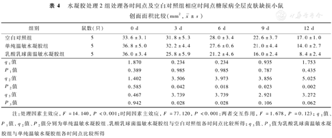 处理0 d,3组小鼠创面面积相近(P>0.05)。处理3、6、9、12 d后,与空白对照组比较,单纯温敏水凝胶组小鼠创面面积无明显变化(P>0.05),乳酸乳球菌温敏水凝胶组小鼠创面面积显著缩小(P<0.05或P<0.01)。与单纯温敏水凝胶组比较,乳酸乳球菌温敏水凝胶组小鼠处理3、6 d创面面积显著缩小(P<0.05)。见表4。