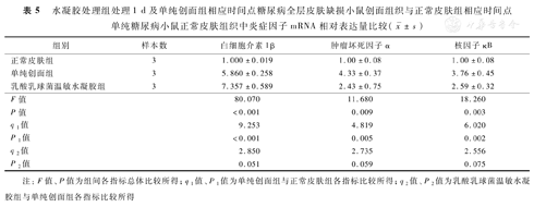 处理1 d后,与正常皮肤组小鼠正常皮肤组织比较,单纯创面组小鼠创面组织中IL-1β、TNF-α和核因子κB的mRNA表达量显著增加(P<0.01)。与单纯创面组比较,乳酸乳球菌温敏水凝胶组小鼠创面组织中IL-1β、TNF-α和核因子κB的mRNA表达量无明显变化(P>0.05)。见表5。