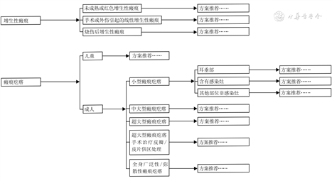 《中国瘢痕共识》将增生性瘢痕分为未成熟或红色增生性瘢痕、手术或外伤引起的线性增生性瘢痕、烧伤后增生性瘢痕3种特殊形式,给予治疗方案推荐;《中国瘢痕疙瘩指南》将瘢痕疙瘩先按照年龄、再按照面积给予分类,分别进行治疗方案推荐(图2)[1, 2, 3]。