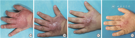 患儿男,21个月,左手沸水烫伤后形成增生性瘢痕,瘢痕面积1%TBSA,瘢痕形成后68 d开始治疗,瘢痕充血、增生、质硬伴瘙痒。首次治疗前VSS评分总分10分,瘢痕血红蛋白水平2.34。行无麻醉强脉冲光治疗2次,单次治疗时间分别为15、10 s;行表面麻醉二氧化碳激光治疗3次,单次治疗时间均为1 min。末次治疗后瘢痕充血消退,增生明显减轻,质地柔软,VSS评分总分4分;瘢痕血红蛋白水平1.65;医患双方对瘢痕疗效满意度均为5分。治疗期间无不良反应。见图1。