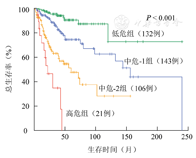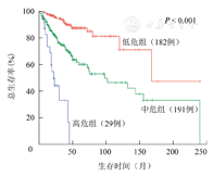 低危组、中危组、高危组分别为182例(45.3%)、191例(47.5%)和29例(7.2%),中位OS期分别为168(95% CI 139~210)个月、98(95% CI 43~152)个月和22(95% CI 15~29)个月,差异具有统计学意义(P <0.001)(图1)。