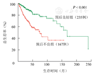 402例PMF患者中,MPLW515突变组的中位OS期未达到,1型及少见型CALR突变组为196(95% CI 156~240)个月,JAK2V617F基因突变组为144 (95% CI 128~176)个月,2型CALR突变组为78 (95% CI 57~96)个月,无JAK2、MPL和CALR基因突变组为60(95% CI 36~78)个月。2型CALR突变组与无JAK2、MPL和CALR基因突变组患者的中位OS期短于其他三组。依据对上述不同基因突变组患者的单因素生存分析结果,我们将基因突变类型分为预后不良组(167例,2型CALR突变或未检测到JAK2、MPL和CALR基因突变)和预后良好组(235例,JAK2V617F、MPLW515、1型及少见型CALR基因突变),中位OS期分别为74和168个月(HR 2.990, 95% CI 1.935~4.619),差异具有统计学意义(P <0.001)(图2)。