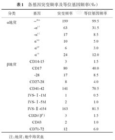 经地贫基因检测试剂盒进行常规基因检测,在1 000份标本中,检出α地贫225例(22.5%),β地贫403例(40.3%),αβ复合地贫15例(1.5%),未检出357例(35.7%)。α地贫中,标准型最多,占61.3%(138/225)。静止型28例;HbH病59例。β地贫中,IVS-Ⅱ-654(163/418)和CD41-42(141/418)两种基因突变最常见,各基因突变频率及等位基因频率见表1。
