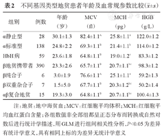 | 组别 | 例数 | 年龄(岁) | MCV(fl) | MCH(pg) | HGB(g/L) |