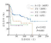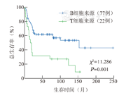 IPI评分0~1、2、3、4分的患者中位OS期分别为142.0、25.0、8.0、8.0个月,4组患者中位OS期差异有统计学意义(P=0.003)(图2)。B细胞来源和T细胞来源PIL患者中位OS期分别为153.0和16.0个月,两组患者中位OS期差异有统计学意义(P=0.001)(图3)。