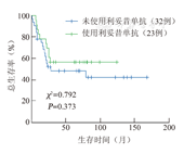 联合手术治疗(74例)和单纯化疗患者(25例)中位OS期分别为79.0和123.0个月,差异无统计学意义(P=0.616)(图4)。将患者分为惰性淋巴瘤和侵袭性淋巴瘤两组,惰性淋巴瘤组中,联合手术(9/16)和单纯化疗(7/16)患者中位OS期分别为未达到和153.0个月(P=0.697);侵袭性淋巴瘤组中,联合手术(65/83)和单纯化疗(18/83)患者中位OS期分别为27.0和123.0个月(P=0.846),手术对两组患者预后差异均无影响。在DLBCL患者中,治疗期间使用利妥昔单抗(23/55)和未使用利妥昔单抗(32/55)患者的中位OS期分别为未达到和28.0个月,差异无统计学意义(P=0.373)(图5)。
