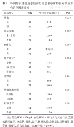 影响99例原发肠道恶性淋巴瘤患者总生存的多因素分析