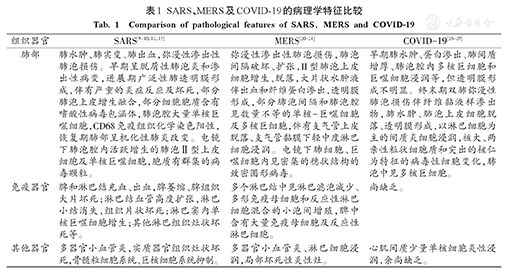 综上所述,通过对SARS、MERS及COVID-19的病理学改变及特征、机制的研究进展进行文献回顾,发现COVID-19与前述两种冠状病毒感染的病理学改变有一定共性。COVID-19与SARS、MERS一样,病理学主要改变靶向于双肺,侵入后造成肺的弥漫性损伤、水肿、透明膜形成(表1),表现以单核巨噬细胞和淋巴细胞渗出为主的炎症细胞浸润和肺泡上皮损伤为主要特征的病毒性肺炎改变。笔者认为,后续通过系统尸体解剖完善病理学研究,能更好地解释COVID-19的临床病理联系及SARS-CoV-2引起肺损伤的机制,为武汉乃至国内外患者的救治提供参考,有助于医生及时制定重症患者的治疗策略。关于传染病尸体检验,笔者曾主刀了第1、第2例SARS死亡病例的尸体检验,参与了第3例的尸体检验,随后又参与SARS的病理学研究,当时是法医和病理专业人员共同组成团队,病理在组织学和病原学的研究方面发挥了作用,法医在尸体检验和死因分析方面的突出表现难以替代。2020年2月16日在武汉金银潭医院完成首例和第2例COVID-19尸体检验,参加人员均为法医病理人员。中国的两次大规模冠状病毒性传染病的尸体检验和研究都有法医的身影,说明法医病理在传染病尸体检验和研究方面的现实作用,有可能为今后法医病理学发展提出了新的方向。