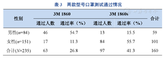 63人佩戴3M 1860通过适合性测试,占测试对象总人数的26.8%,97人佩戴3M 1860s通过测试,占41.3%。前者作为男性测试对象首选测试型号口罩,通过人数占男性对象总数的54.7%,13人更换3M 1860s后通过测试。女性测试对象中,84人首选3M 1860s并通过测试,占女性测试对象总数的55.7%。见表3。