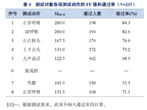 各项测试动作的FF值与通过情况见表4,随着动作1(正常呼吸)至动作7(弯腰),FF值呈下降趋势。其中,上下点头、大声说话、弯腰等测试动作的FF值相对较低,动作7(弯腰)FF值及通过率均为最低。动作8相较动作1,测试动作同样为正常呼吸,但动作8的通过率均较动作1显著下降(χ2Pearson=11.1,P<0.05)。