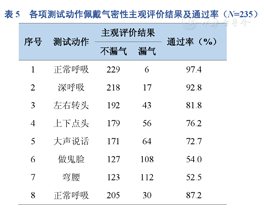 调查人员使用问卷记录测试对象在执行各项测试动作时对口罩佩戴气密性的主观评价意见,"漏气"为不通过,"不漏气"为通过,见表5。