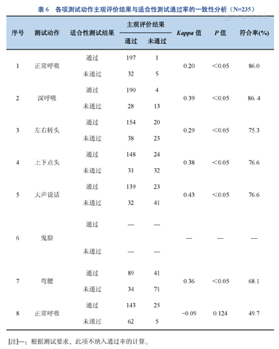 各项测试动作主观评价结果与适合性测试通过率的一致性分析(N=235)