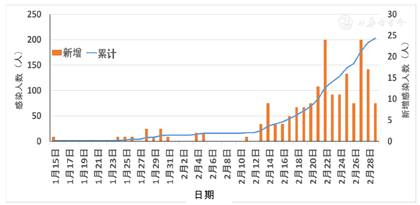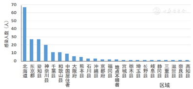 自2月中旬以来日本的SARS-CoV-2感染者数量持续增加(图1)。截至2月底,日本已进行了1 688次RT-PCR检测,确认224例阳性感染者,其中有症状者206例,至少23例重症患者使用了人工呼吸机或需重症监护病房治疗,其中5例死亡。按地区划分,北海道最多,为67例,其次是东京都27例,爱知县27例和神奈川县20例,遍及日本的多个地区。