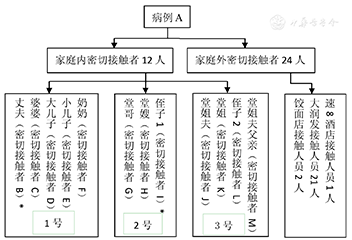2020年2月,江苏扬州某县一起家庭聚集性疫情中的李某一家人,李某为确诊病例,家庭内密切接触者12人,包括家人(丈夫、婆婆、大儿子、小儿子、奶奶)共5人、堂兄一家3人(堂兄、堂嫂、侄子1)、堂姐一家4人(堂姐夫、堂姐、侄子2、堂姐夫父亲),其中丈夫和侄子1诊断为无症状感染者,另有家庭外密切接触者24人。
