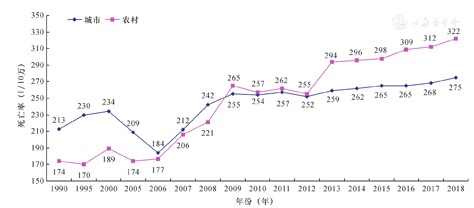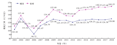 2018年,中国居民脑血管病(粗)死亡率为149.49/10万,占总死亡人数的22.33%,位居死因顺位的第3位。城市居民脑血管病死亡率为128.88/10万,农村为160.19/10万。男性(164.31/10万)高于女性(134.15/10万)。2003—2018年,农村居民脑血管病各年度的粗死亡率均高于城市居民(图6)。