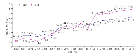 2002—2018年急性心肌梗死(AMI)死亡率总体呈上升态势,从2005年开始,AMI死亡率呈快速上升趋势,农村地区AMI死亡率于2007年、2009年、2011年超过城市地区,自2012年开始农村地区AMI死亡率明显升高,并于2013年起持续高于城市水平(图5)。