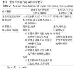 | 临床特征 | 重度非IgE介导的牛奶蛋白过敏 | 重度IgE介导的牛奶蛋白过敏 | ||