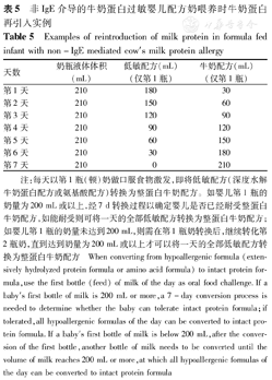 IgE-CMPA需要在医院有急救条件的情况下进行OFC[21](方法可见相关指南)。轻中度non-IgE-CMPA可在家里做家庭再引入的OFC[25](附iMAP指南-配方奶喂养再引入牛奶蛋白实例,见表5)。但是如果临床经验不足,无法从临床特征判断出IgE-CMPA或non-IgE-CMPA的情况下,必须是过敏原检测牛奶蛋白sIgE阴性且既往也未发生过速发型过敏反应的婴儿才可以进行家庭再引入的OFC[17]。而重度non-IgE-CMPA的婴儿仍需在医院有急救条件的情况下进行OFC[17,21]。