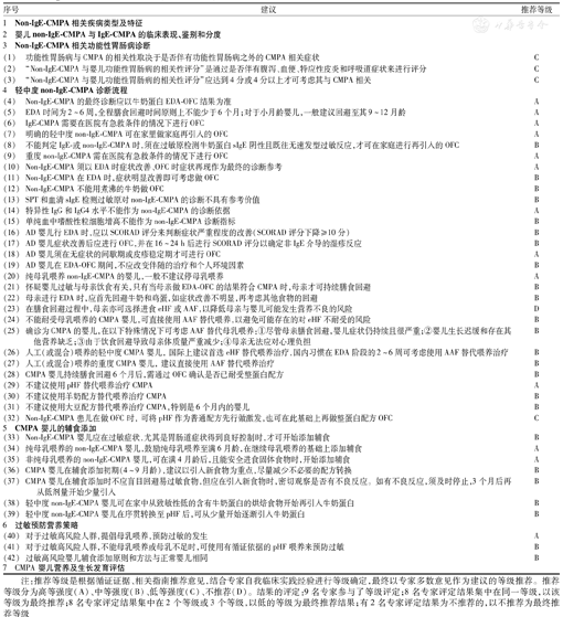 本指南涉及non-IgE-CMPA问题共7大类42条建议。所有建议推荐的原则,除了根据文献的等级外,采用了专家投票方式进行等级推荐。专家参照2001年英国牛津循证医学证据分级和推荐意见强度[9]、相关指南推荐的强度和自我临床实践中的经验进行等级确定,最终以专家多数意见作为建议的等级推荐(附录1)。