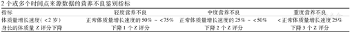 | 体质量增长速度(<2岁) | 正常体质量增长速度的50%~<75% | 正常体质量增长速度的25%~<50% | <正常体质量增长速度25% |