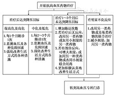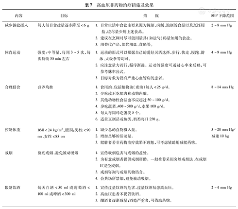 | 非药物治疗 | 减少钠盐的摄入量;减轻体重;多吃水果和蔬菜,减少食物中饱和脂肪酸的含量和脂肪总量;减少过多的酒精摄入;适当运动;减轻精神压力,保持心理平衡;戒烟 | 对于患者做改善生活方式的宣教;强调注意膳食中的合理配伍、注意通过适当运动控制体重的过度增加;强调戒烟 |