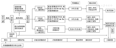 1)高血压的检出:社区高血压患者的筛查有以下几个途径:(1)健康档案:社区建立居民档案,档案的基本内容包括个人一般情况、家族史、现病史、生活方式等,并可结合当地实际情况进行增补。将健康档案与社区常规的诊疗信息系统连接起来,开展持续性保健服务。(2)体检:体检发现高血压患者。(3)门诊就诊:常规门诊就诊的患者通过测量血压发现新的高血压患者。(4)其他途径的机会性筛查:如流行病调查等。(5)场所提供测量血压的装置:职工可随时测量血压,以及时发现血压升高。(6)家庭自测血压:自我测量血压以及时发现血压升高。