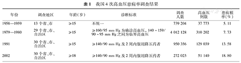 | 年份 | 调查地区 | 年龄(岁) | 诊断标准 | 调查人数 | 高血压例数 | 患病粗率(%) |