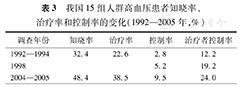 高血压患者知晓率、治疗率和控制率是反映高血压防治状况的重要指标。根据我国2次较大规模高血压患者知晓率、治疗率和控制率抽样调查(表2)[5,6]以及15组人群1992—2005年期间3次调查的变化(表3)[7],我国高血压患者总体的知晓率、治疗率和控制率较低。近年来,经过全社会的共同努力,高血压知晓率、治疗率和控制率有明显提高,但仍分别低于50%、40%和10%。农村低于城市;男性低于女性;经济欠发达地区低于较发达地区。