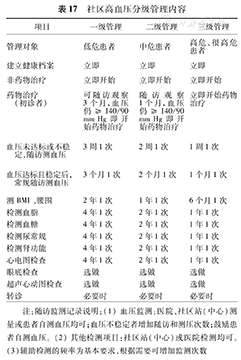 根据危险分层:低危、中危、高危和很高危,将高血压患者分为一级、二级、三级管理(表17)。