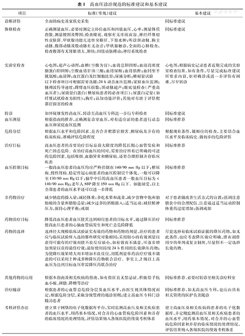 目前,全国统一的医疗服务与保障体系尚未建设完成,而各省、市、自治区之间的经济与社会发展水平又存在很大差异。因此,本指南对高血压的诊治规范设定为标准建议和基本建议(表1)。