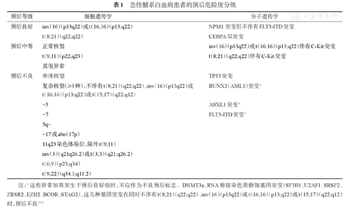 目前国内主要是根据初诊时白血病细胞遗传学和分子遗传学的改变进行AML预后危险度判定[3,5,6,7]。具体见表1。
