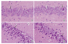 留取大鼠海马组织,40 g/L多聚甲醛固定,石蜡包埋,取冠状切面,HE染色,采用双盲法在显微镜下观察海马CA1区神经元结构改变。