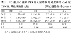 NC组大鼠海马CA1区见极少量TUNEL阳性细胞;HC组大鼠海马CA1区可见少量TUNEL阳性细胞;PFS组于6 h海马CA1区TUNEL阳性细胞数显著增加,24 h达高峰。与NC组和HC组相应时间点相比,PFS组在6 h后各时间点海马CA1区TUNEL阳性细胞数均显著高于NC组及HC组(P均<0.01),NC组与HC组相比,海马CA1区神经元凋亡细胞数差异无统计学意义(P>0.05),结果见表1、图2。