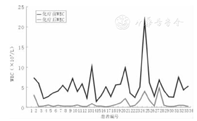 本组患儿化疗前WBC及化疗后WBC的最低值比较差异有统计学意义(P=0.000),即化疗后WBC明显低于化疗前。66例次CAV方案化疗时,有56例次化疗的WBC发生Ⅳ度毒性(WBC<1.0×109/L),其发生率约为84.8%,WBC的Ⅰ度毒性有2例次(3.03%),Ⅱ度毒性1例次(1.52%),Ⅲ度毒性6例次(9.09%)。CAV1和CAV2 2个疗程的超大剂量CTX为主的方案化疗时,WBC化疗前及化疗后最低值的数值分布曲线图见图1、图2。