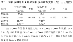 注:与2008年肾积水例数比较,aP=0.01;与2009年比较,cP=0.01;与2010年比较,eP=0.01。与2008年结石例数比较,bP<0.05;与2009年比较,dP<0.05;与2010年比较,fP<0.05。肾积水例数的比较采用Fisher's精确概率法