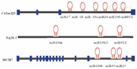 选择NCBI blast、NCBI mapviewer、UCSC Browser工具分析发现miR-17-92位于人的第13号染色体上C13orf25基因初级转录本的第3个内含子区,编码miR-17-5p、miR-17-3p、miR-18a、miR-19a、miR-20a、miR-19b-1和miR-92-1等7个miRNAs,根据他们的种子序列可以将miR-17-92 cluster分为3个家族:miR-17家族(miR-17、miR-18、miR-20),miR-19家族(miR-19a、miR-19b)和miR-92家族。miR-106a-363基因簇位于人和小鼠的X染色体上,包含miR-106a、miR-18b、miR-20b、miR-19b-2、miR-92-2和miR-363 6个miRNAs,miR-106b-25基因簇包含miR-106b、miR-93和miR-25,位于人第7号染色体上蛋白质编码基因MCM7的第13个内含子区,见图1。