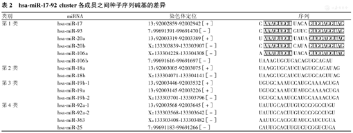 hsa-miR-17-92 cluster各成员之间种子序列碱基的差异