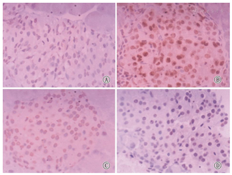 采用TUNEL法检测,操作按照试剂盒说明进行。将胰腺组织切片置于光学显微镜下观察,胰岛细胞核呈棕褐色为阳性凋亡细胞。每张切片选取3个阳性细胞数较多的高倍视野,计算平均每100个胰岛细胞中阳性细胞所占的百分比,即胰岛细胞凋亡率。