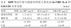 收集MPP患儿60例为MPP组,选取同期体检的30例健康儿童为健康对照组。应用放射免疫法和免疫比浊法检测2组儿童血清hs-CRP、IL-6和GM-CSF水平。