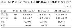 MPP患儿治疗前后hs-CRP、IL-6和GM-CSF水平比较(