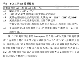 ET主要特点为BPC明显增高,骨髓中巨核细胞增殖旺盛。2008年,WHO制定了新的诊断标准[7]:(1)BPC持续>450×109/L;(2)骨髓活组织检查提示主要为巨核系增生,且以成熟的大巨核细胞数量增加为主,无明显粒系或红系增生;(3)无符合WHO诊断标准的慢性髓细胞白血病(CML)、PV、IMF、骨髓增生异常综合征(MDS)或其他骨髓增殖性疾病;(4)JAK2 V617F基因或其他克隆标记的表达,或无RT的证据;诊断要求符合所有4条标准。由于JAK2 V617F基因在PV、ET、IMF中均可能有所表达,骨髓活检及细胞遗传学检查也成为ET诊断的重要依据。2010年,英国血液学标准委员会(BCSH)以WHO 2008诊断标准为基础,提出了自己的ET诊断指南[8],见表1。