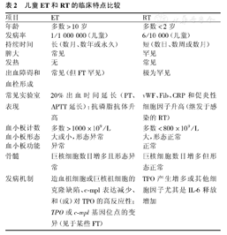 与ET相比,儿童RT在发病年龄、发病率、临床表现、实验室检查及发病机制等各方面均有显著不同,见表2。
